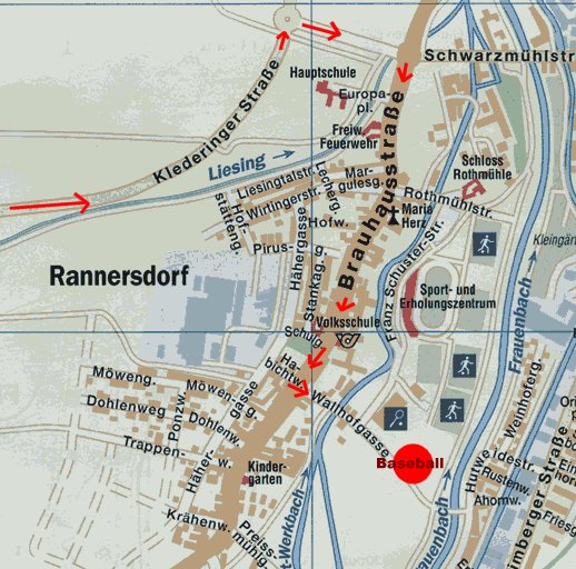 Man fährt die Oberlaaerstrasse (später Klederingerstrasse) immer gerade aus stadtauswärts. Kurz vor Schwechat kommt man zu einem Kreisverkehr den man gleich wieder bei der nächsten Ausfahrt verlässt. Es folgt ein weiterer Kreisverkehr, den man man in die Brauhausgasse verlässt (erneut gleich die nächste Ausfahrt aus dem Kreisverkehr). Die Brauhausgasse fährt man bis zur Wallhofgasse, in welche man links einbiegt (ist mit einem kleinen grünen Schild "Baseballplatz" auf der rechten Strassenseite der Brauhofgasse beschrieben). Dann fährt man immer gerade aus bis linker Hand der Baseballplatz auftaucht wo man auch parken kann.